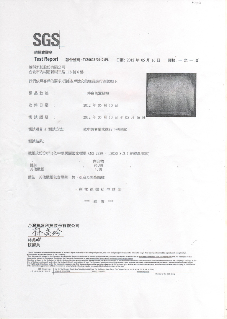 蠶絲材質檢驗合格報告書
